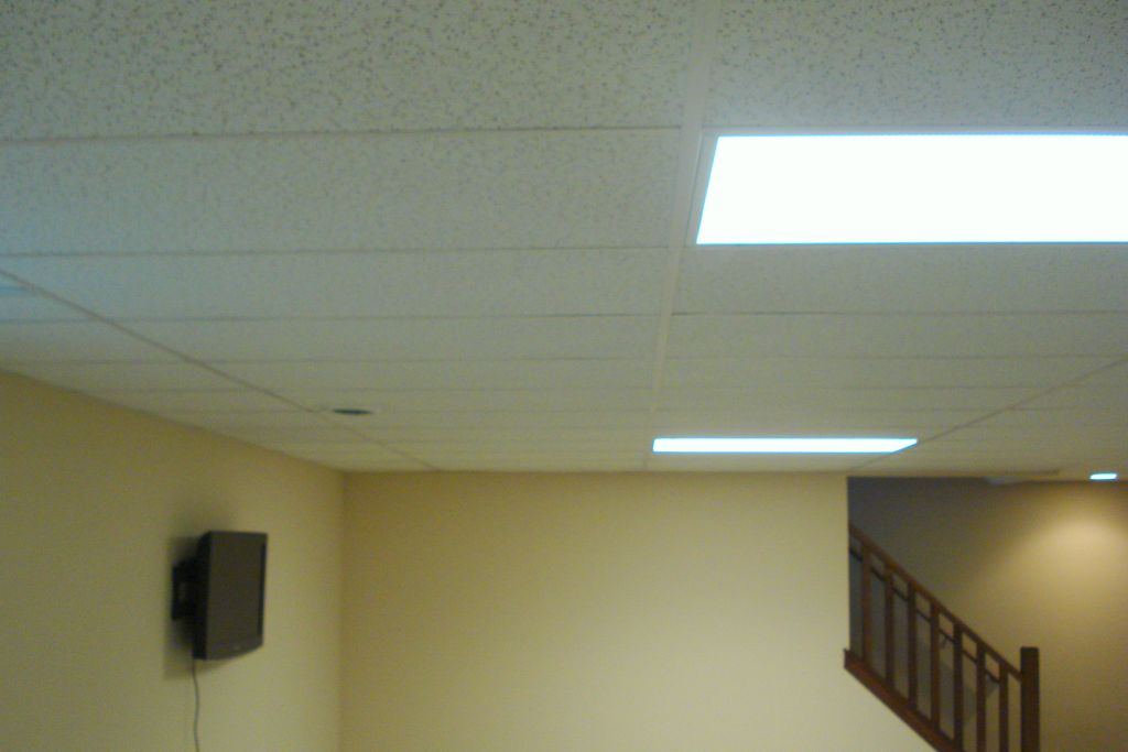 This basement got a fresh look with a new drop ceiling using Armstrong Dune 2x2 tile; the client chose to box around an unattractive beam with ceiling tile, meanwhile preserving the ceiling height.