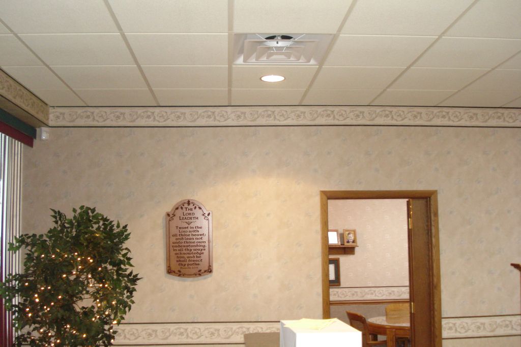 This local business received a new look with a suspended ceiling. Armstrong Cirrus 2x2 tile was used for the ceiling; this finely textured tile provides good acoustics and a high light reflectance. A combination of can lights and 2x4 fluorescent lights was used.