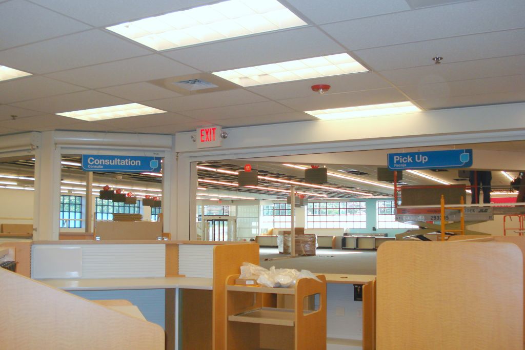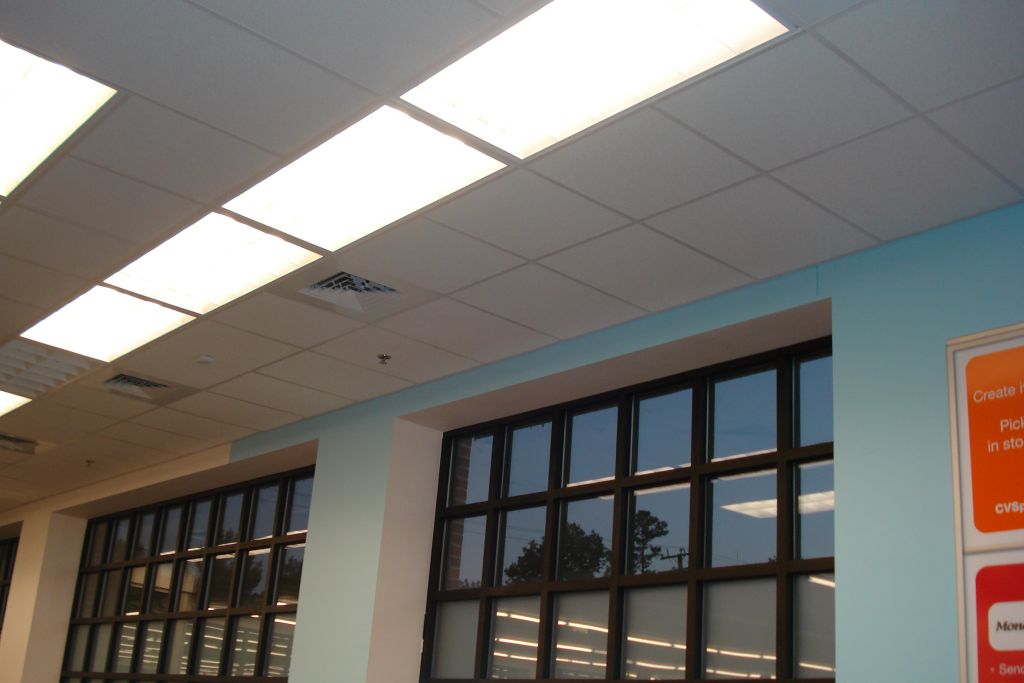 CVS in Richmond, VA. Armstrong Cortega 769 2x4 square edge lay in tile was used for the interior ceiling; Vinyl Gympsum (waterproof) tile was used for the Pharmacy drive-thru.